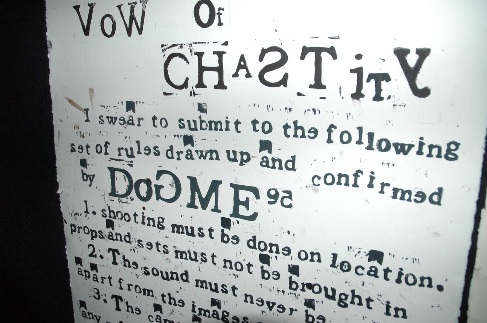 Если Трюффо и его единомышленники боролись за свободу режиссёрского высказывания против диктата сценаристов, то датские бунтари пошли дальше — они предложили добровольно надеть на себя смирительную рубашку правил, чтобы обрести подлинную свободу. Сердцем манифеста стал «Обет целомудрия» — десять ключевых заповедей.