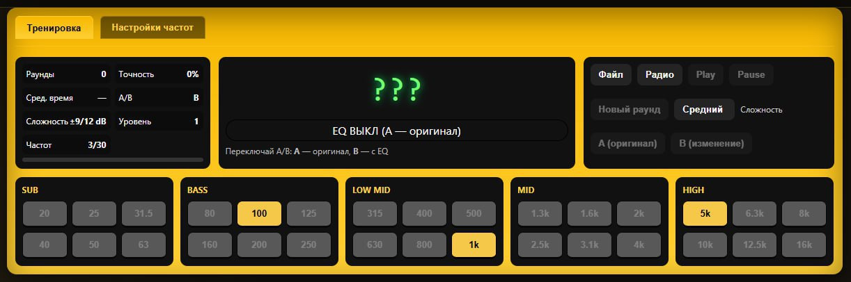 Простой онлайн-тренажёр: загружаешь трек, он изменяет частоты, а твоя задача — угадать, где произошло срезание или усиление.